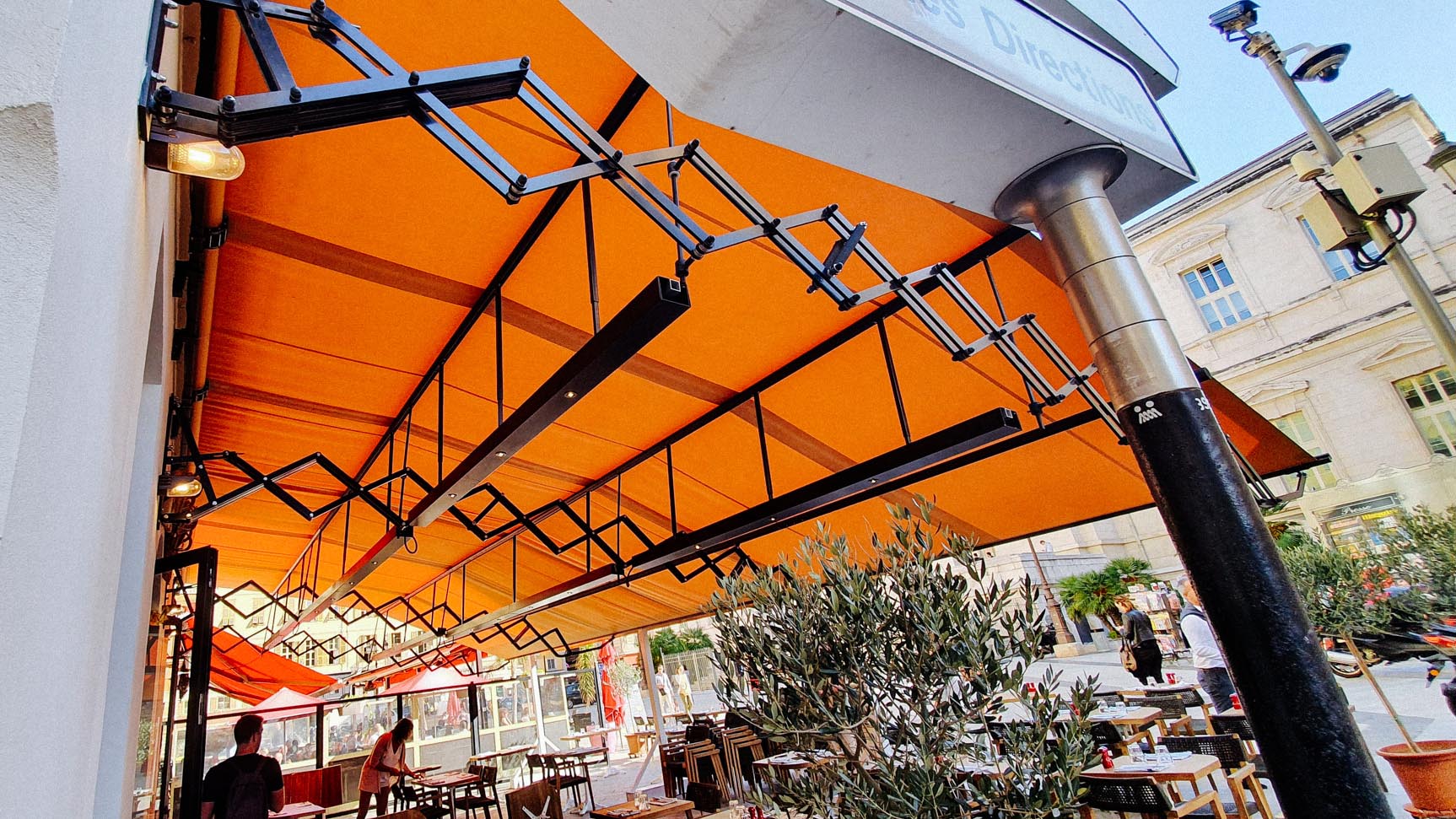 Pour une brasserie ou un restaurant urbain, le store grand format est souvent la réponse la plus lisible. Il protège vite, respecte la façade, et s’adapte bien aux terrasses sur domaine public quand l’espace doit rester maîtrisé.